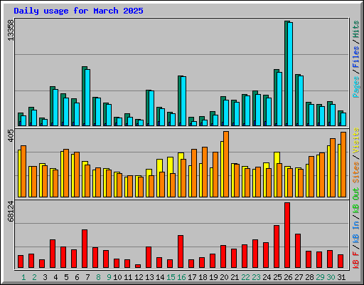 | Day | Hits | Files | Pages | Visits | Sites | kB F | kB In | kB Out | ||||||||